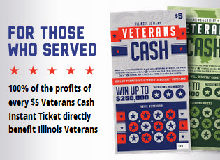 The $5 Veterans Cash instant tickets (game #977) are currently available at about 950 retail locations across Illinois. There is one top prize of $250,000 in Veterans Cash remaining to be claimed. The Lottery has raised over $12.5 million for Illinois Veterans groups to date. Veterans Cash instant game proceeds exclusively benefit Illinois veterans, and are provided as grants to dozens of groups that provide vital services to, and in many cases employ, Illinois veterans. A series of videos highlighting some of these groups can be found at http://mobile.illinoislottery.com/en-us/Specialty_Tickets/VeteransCash.html