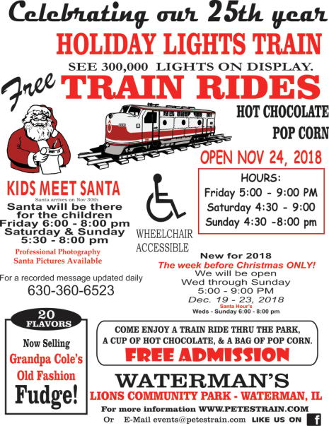 The 25th Annual Holiday Lights Train by the Waterman & Western Railroad (aka Pete’s Train) will pull out of the station beginning Saturday, November 24, 2018 at 5:00 p.m., and run on weekends (Fri. – Sun.) through December 23rd.