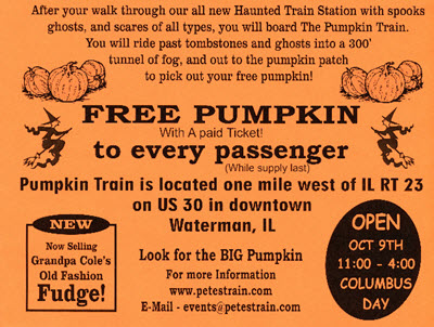Pete’s Train, aka, the Waterman & Western Railroad, opens this coming weekend and will run through Halloween, October 31st, 2017. New last year, is a Bounce House on the property. The Pumpkin Train includes a Haunted House for younger people, Blood, No Guts, No Gore, just an old fashion smoke and mirrors Spook House.
