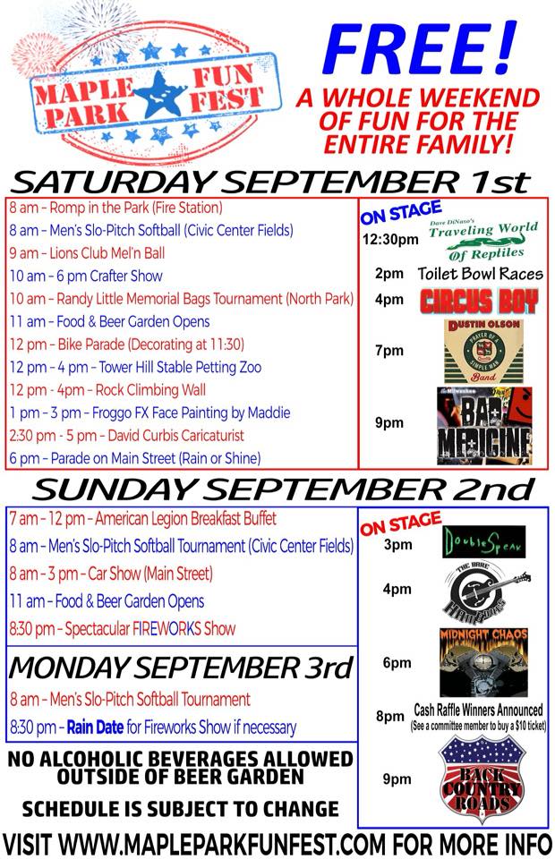 Come on out to Maple Park the weekend of September 1-3, 2018 and experience “a classic small town festival geared for big time entertainment”!