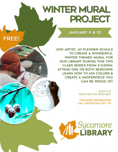 Join artist, Jo Plenger-Schulz to create a wonderful winter-themed mural for our library during this two class series from 4-5:30pm. Attend one or both sessions! Learn how to mix colors & create a masterpiece you can be proud of! Ages 8-12. Registration required.