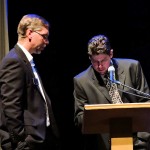 - Matt Duffy (DeKalb Chamber) and Eric Olson (Daily Chronicle) discussing last minute details for the candidate forum at the Egyptian Theatre