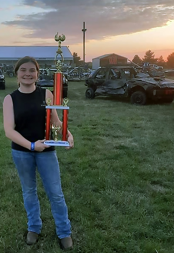 Then, her stepfather and stepsisters got her hooked on demolition derby. She holds trophies from competing around the area.