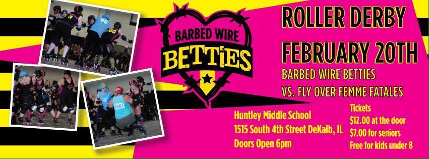 This Saturday, February 20th, 2016, you’re invited to the Season opener for the Barbed Wire Betties! The event will go down at the Huntley Middle School, 1515 South 4th Street in DeKalb. Doors open at 6pm with 1st whistle at 6:30pm.