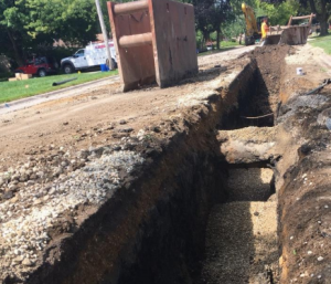 Street continues. Crews continue digging west to First Street. Once digging is complete, the contractor inserts the new water main and backfills the trench with stone gravel. They will repeat the process on the other scheduled water main replacements. After all mains are inserted, the contractor returns to tie into the live water mains. However, before going live, Public Works tests the main for microbial contaminations and performs a pressure test. A satisfactory result from both tests permits the main to go live permanently.