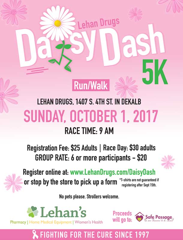 The Lehan Drugs’ Daisy Dash was started as a way to kick off Women’s Health Week and as an opportunity to raise additional funds for cancer programs. Lehan’s chose to give to the mammography fund so no one has to go without getting a mammogram, no matter the person’s financial circumstances. This year’s proceeds will also go to Safe Passage, the area’s domestic violence shelter in DeKalb.