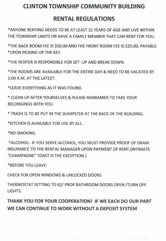 Community Building address: 160 W. Lincoln Highway, Waterman, IL 60556