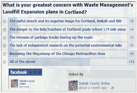 The Cortland Township Electors Association is an organization of registered voters who reside in Cortland Township. They are raising funds to pay the legal fees required to get the Illinois courts to hear their plea for relief from the County Board’s decision to sell massive dumping rights into Cortland Township soil at the DeKalb County Landfill owned and operated by Waste Management of Illinois.