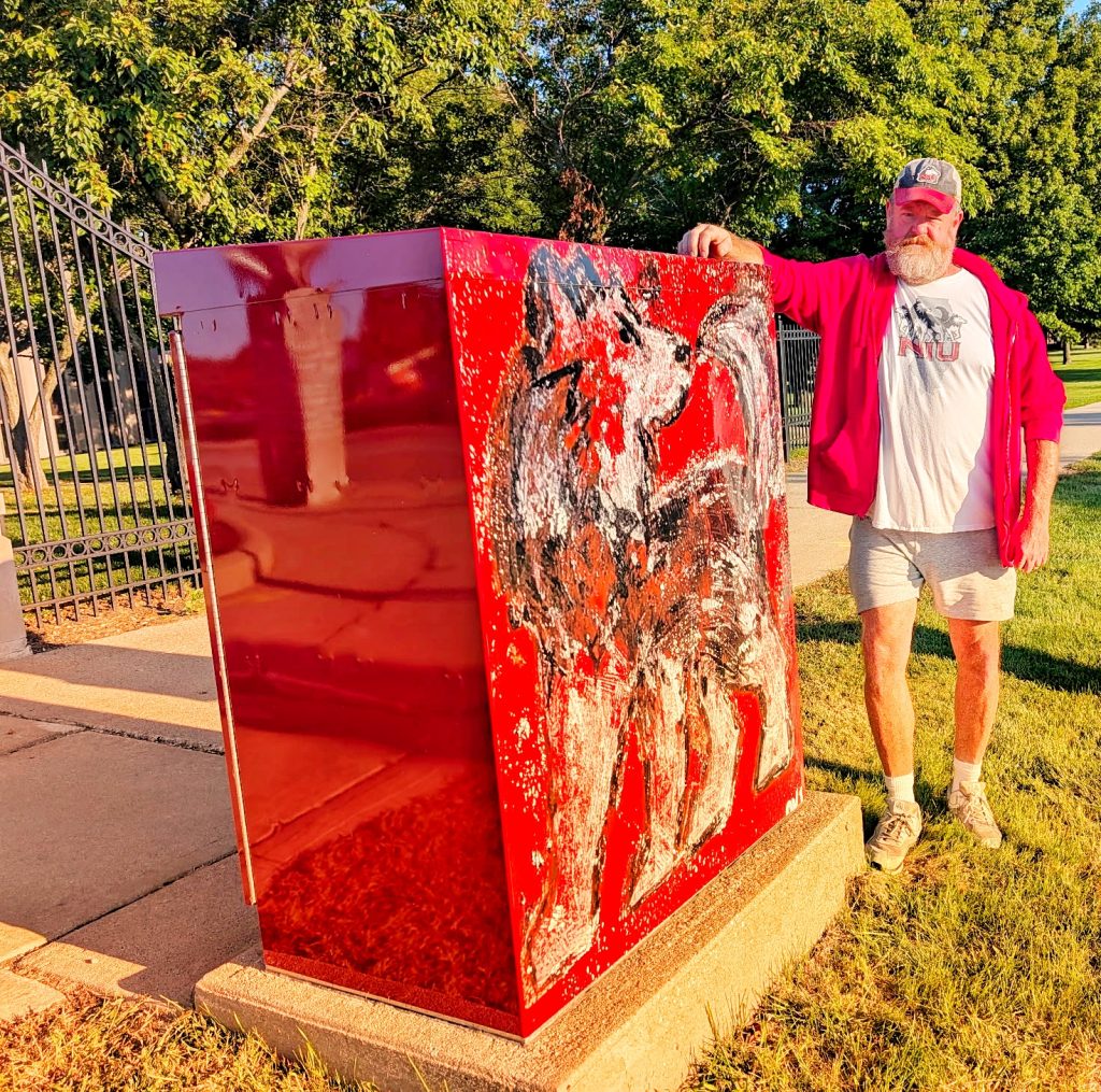 1 – Doug Overton, a Master of Fine Arts student at Northern Illinois University, painted “NIU Corn Huskie,” which is featured on the utility box mural near the NIU campus at Annie Glidden Road and Lucinda Avenue.