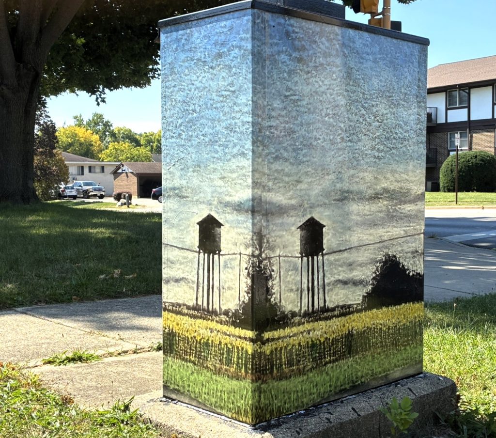 3 – The utility box mural at the entrance to DeKalb High School features the painting “Welcome to DeKalb, Illinois” by Christine Perkovich of DeKalb.