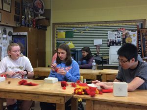 Hinckley-Big Rock FFA members make apples out of wool for a display as a connection to their apple orchard. Shown are members (from left) Hope Larson, Tori Prellberg and Gabe Oeters. The Royal Orchard was established two years ago.