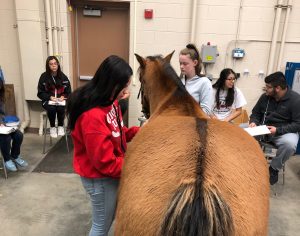 DeKalb FFA member and Animal Science student Maddie Clark (center) practices restraint and handling of both small and large animals while classmates take down vital signs.