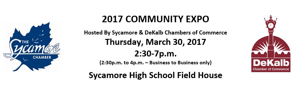 Don’t miss the Community Expo today, Thursday, March 30th, 2017 at the Sycamore High School Field House hosted by the DeKalb and Sycamore Chambers of Commerce. From 2:30-4pm is a Business to Business Only time at the Expo and from 4-7pm the whole community is invited!