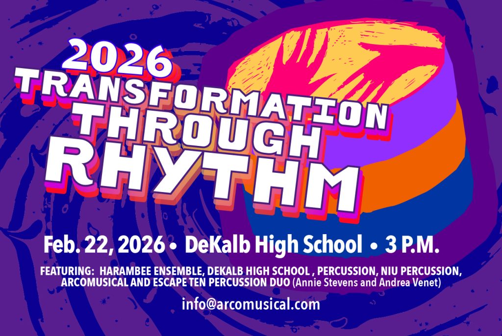 More Information: As a proud DeKalb County Nonprofit Partnership Community Partner, Arcomusical cordially invites the DeKalb community to attend Transformation Through Rhythm, an annual event to drum up a good cause! held at the DeKalb High School Auditorium on Sunday afternoon February 22nd at 3PM. The concert will feature the percussion duo Escape Ten, a nationally-recognized ensemble founded by percussionists Dr. Andrea Venet (University of North Florida) and Annie Stevens (Virginia Tech University), as well as beloved local percussion groups: Harambee Ensemble, DeKalb High School Percussion Ensemble, Northern Illinois University Percussion Ensemble, and Arcomusical. All donations received will benefit the more than 150 non-profit organizations based in and/or serving DeKalb County. Admission is free, and donations will be collected both digitally and in-person at the event.