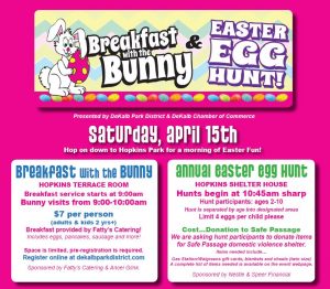 In DeKalb, the Park District is hosting a Breakfast with the Bunny and Easter Egg Hunt from 9:00 AM TO 11:30 AM at Hopkins Park, 1403 Sycamore Road in DeKalb. See image to the right or DeKalb Park District’s website for all the particulars. Register Here or call (815) 756-6306 with questions.