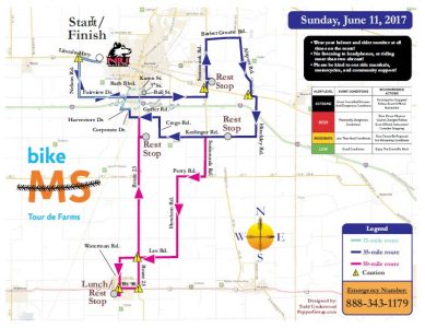 Last year Bike MS: Tour de Farms raised over 1.45 million dollars for the National Multiple Sclerosis, Greater Illinois Chapter. The event attracts over 1,500 riders and volunteers to the city of DeKalb, Ill. The bike ride takes place over two days and 200 miles and offers various route options for all levels of cyclists. This year’s event will take place at the Northern Illinois University Convocation Center this weekend, June 10 & 11, 2017. To help bring us all closer to a world free of MS, each event participant agrees to raise the minimum pledge of $300.