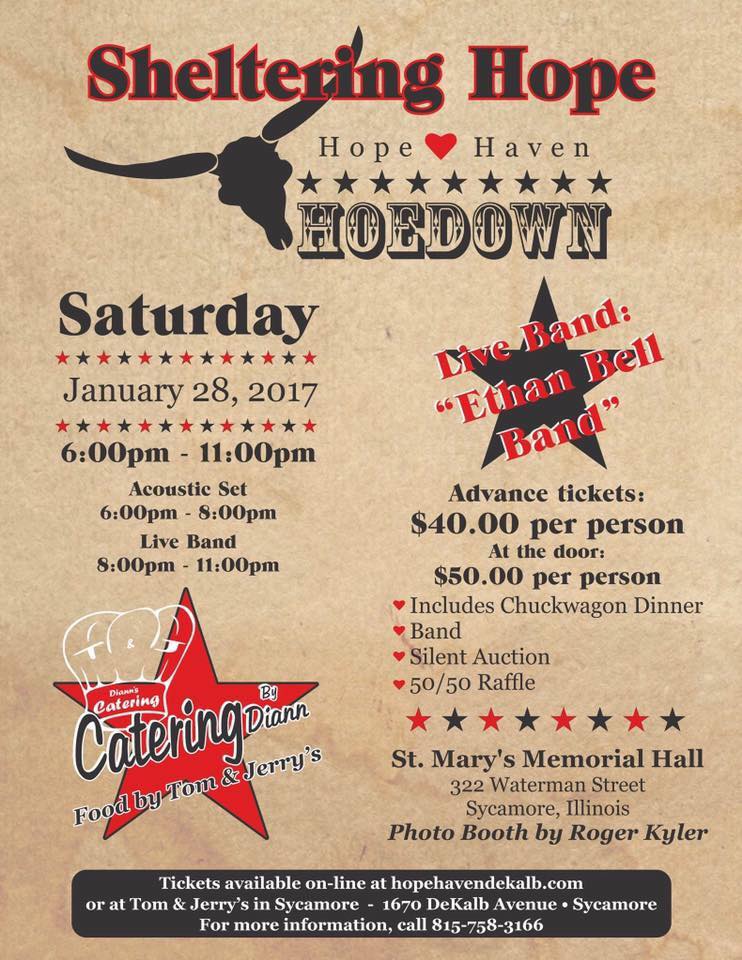 Hope Haven is sponsoring a Sheltering Hope Hoedown this Saturday, January 28th, 2017 from 6:00pm to 11:00pm. Tickets include a Chuckwagon Dinner, live music from the Ethan Bell Band, a Silent Auctions and a 50/50 raffle. Have lots of fun with the Photo Booth on site by Roger Kyler too!