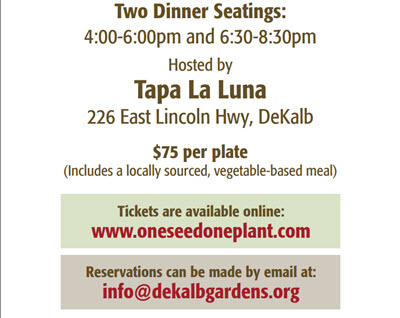 Tickets are available for online purchase at www.oneseedoneplant.com and reservations can be made by email at info@dekalbgardens.org.