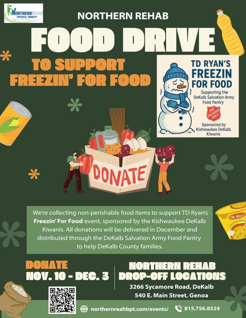 Northern Rehab Physical Therapy Specialists is hosting a community food drive in support of T.D. Ryan’s “Freezin’ for Food” event, sponsored by the Kishwaukee DeKalb Kiwanis.