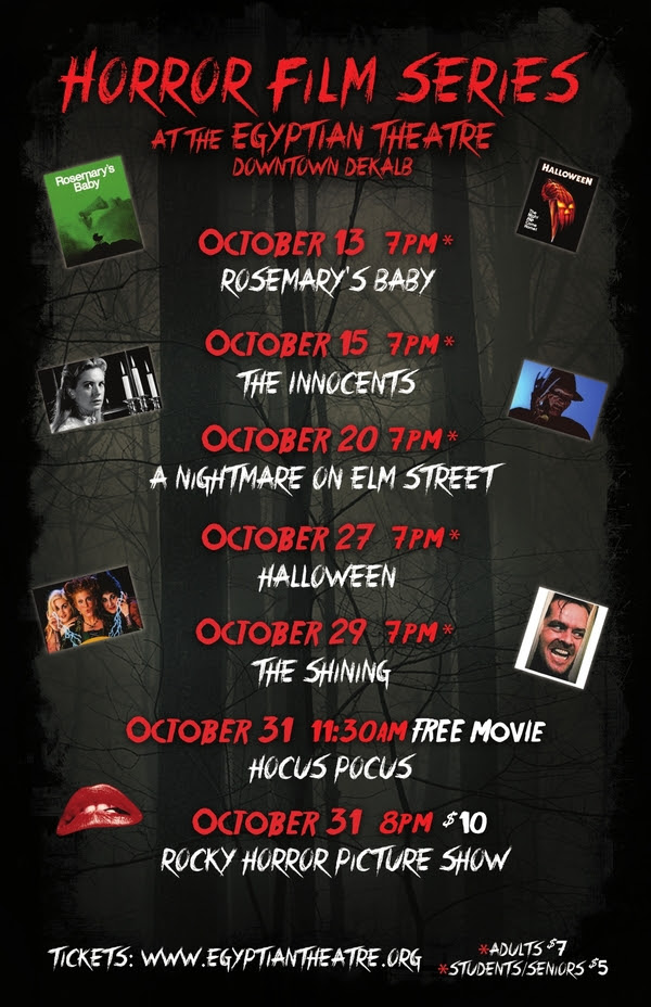 Come to the Egyptian Theatre in downtown DeKalb this October for their Horror Film Series running throughout the month. The first movie in the series is tomorrow, Tuesday, October 13th at 7pm and it will be “Rosemary’s Baby.” See the full schedule of movies below. Admission to all the movies is $7 for adults and $5 for Students/Seniors.