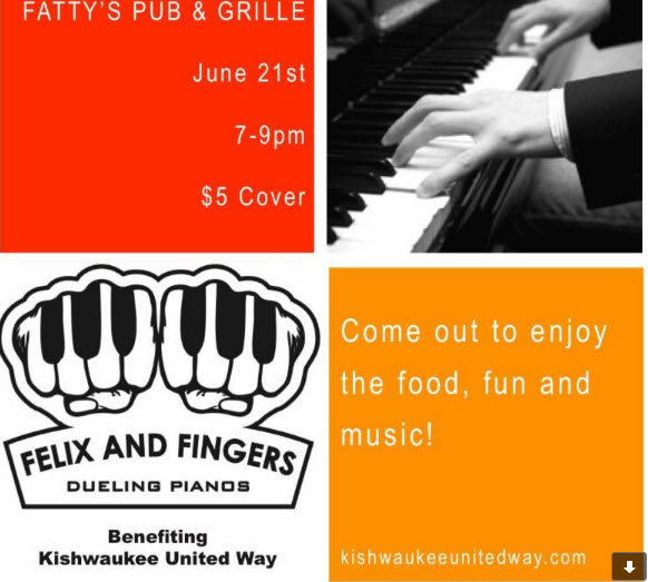 Don’t have plans? And Thirsty Thursday is Near! Bring your friends and to Fatty’s Pub and Grill for a Fundraiser to benefit the local DeKalb County area. On Thursday, June 21st, the humorous tunes of Felix and Fingers, and the sounds of their dueling pianos brings together a one of a kind show that plays music and comedy for a night that will have you laughing for the weeks to come. Have your music list of favorite songs ready for requests! A $5 cover will benefit Kishwaukee United Way!