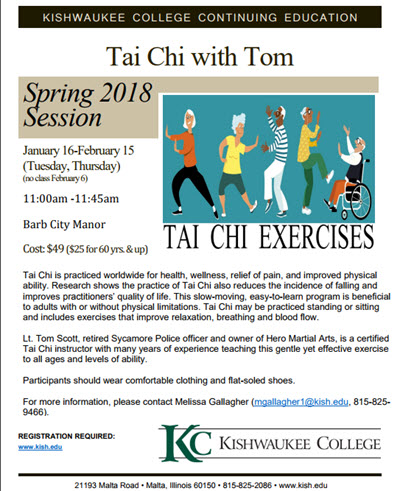 Kishwaukee College and Barb City Manor will be offering Tai Chi with Tom Tuesdays and Thursdays January 16th, 2018 through February 15th from 11:00-11:45 at Barb City Manor, 680 Haish Blvd. DeKalb.