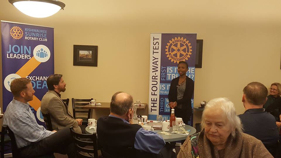 Kishwaukee Sunrise Rotary meets at The Lincoln Inn every Tuesday at 7:00am. Come stop in for information on how to join. Today’s speaker was Revela Odhuno graduate of Jane Adeny Memorial in Kenya. She is currently studying nursing at Northern Illinois University.