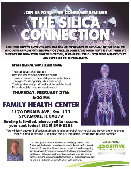 Join the Family Health Center for a free consumer seminar this Thursday, February 27th, 2014! Everyone knows someone who has had an operation to replace a hip or knee or who suffers from arthritis pain or swollen joints. The good news is that when we support the body with proper nutrition, it can heal itself. Even from diseases that are supposed to be permanent!