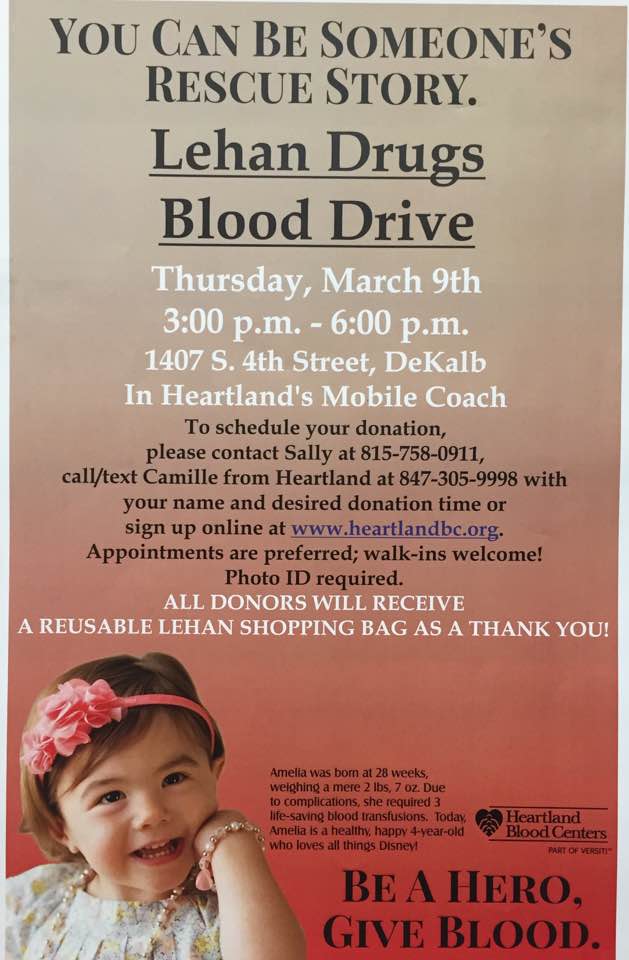 Lehan Drugs is hosting a Blood Drive this Thursday, March 9th in Heartland’s Mobile Coach at Lehan’s location at 1407 S. 4th Street in DeKalb, from 3:00pm until 6:00pm. To schedule your donation please contact Sally at 815-758-0911 or call or text Camille from Heartland at 847-305-9998 with your name and desired donation time or sign up online at heartlandbc.org. Appointments are preferred but walk-ins are welcome. Photo ID required to donate blood.