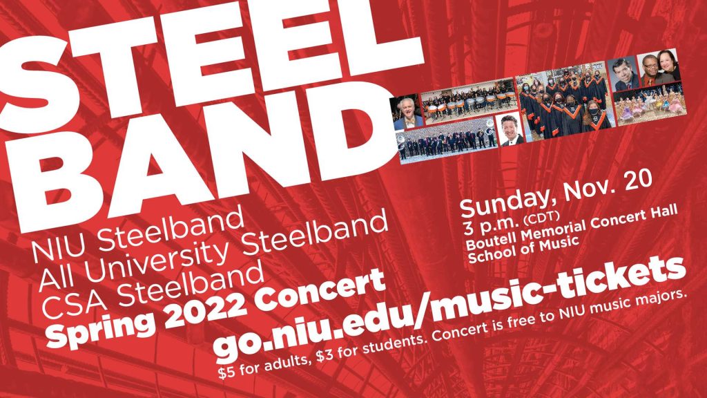 Get ready for NIU Steelband, the University Steelband & CSA Steelband coming together at the Boutell Memorial Concert Hall for an amazing concert Sunday evening. The performance will feature Malta and Jefferson Elementary Schools. You can register online at calendar.niu.edu/events