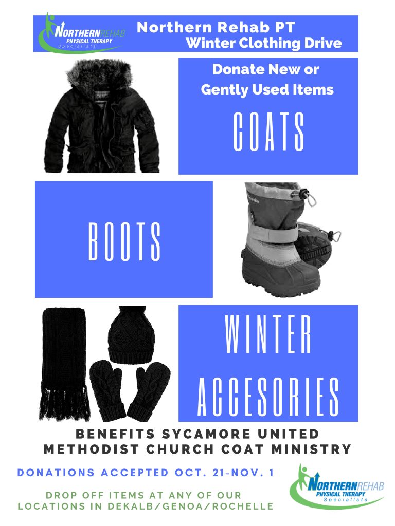 DEKALB – Northern Rehab Physical Therapy Specialists is collecting donations for the Sycamore United Methodist Church (SUMC) Coat Ministry. Needed items include new and gently used coats, boots, mittens, scarves, and other winter accessories.