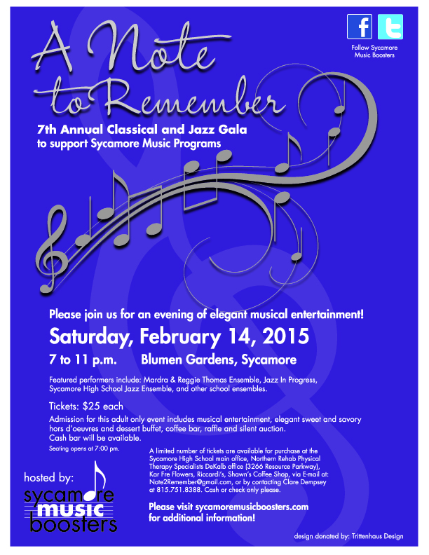 A limited number of tickets are available for this adult-only event at $25.00 per person which includes musical entertainment, hors d’oeuvres and coffee bar. A cash bar will also be available. Tickets are on sale now at the Sycamore High School main office, Northern Rehab Physical Therapy Specialists 3266 Resource Parkway office in DeKalb, Kar Fre Flowers, Riccardi’s, Shawn’s Coffee Shop, via email at Note2Remember@gmail.com or by calling Clare Dempsey 815.751.8388. For more information, please visit www.sycamoremusicboosters.com and follow them on Facebook and Twitter.