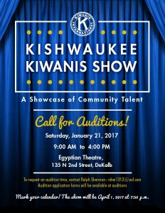The Kishwaukee Kiwanis Club is looking for local talent for a show on April 1 at the Egyptian Theatre in DeKalb. The event will be a showcase of community talent in a two-hour show. All types of talent are encouraged to audition on Saturday, January 28th, from 9am to 12 noon at the Egyptian Theatre.