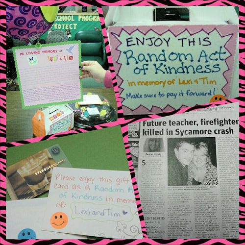 Friday it will be three years since we tragically and unexpectedly lost Tim Getzelman and Lexi Weber on 2/21/11. In the spirit of their giving nature and devotion to the community, on Friday, February 21st, 2014, Tim and Lexi’s family and friends are asking that you please smile and pay it forward by performing two Random Acts of Kindess in their memory.