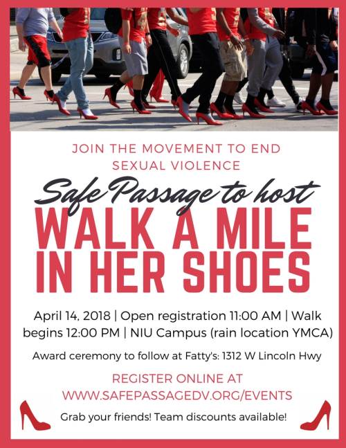 “Walk a Mile serves as an opportunity for our community to come together to say that sexual violence is not tolerated,” says Executive Director, Mary Ellen Schaid. “The event is a unique and fun way to raise awareness.” If the weather doesn’t cooperate, the event will move from NIU’s campus to the Kishwaukee Family YMCA in Sycamore.