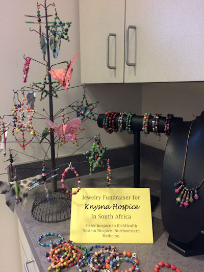 “New this year, we have started a ‘bead market’ and have a committee working diligently to create beautiful jewelry with African beads,” said Jen Conley, MTBC, LPC, music therapist at KishHealth System Hospice, part of Northwestern Medicine. “All of the proceeds from the sales of this handmade jewelry will go to Knysna Hospice.”
