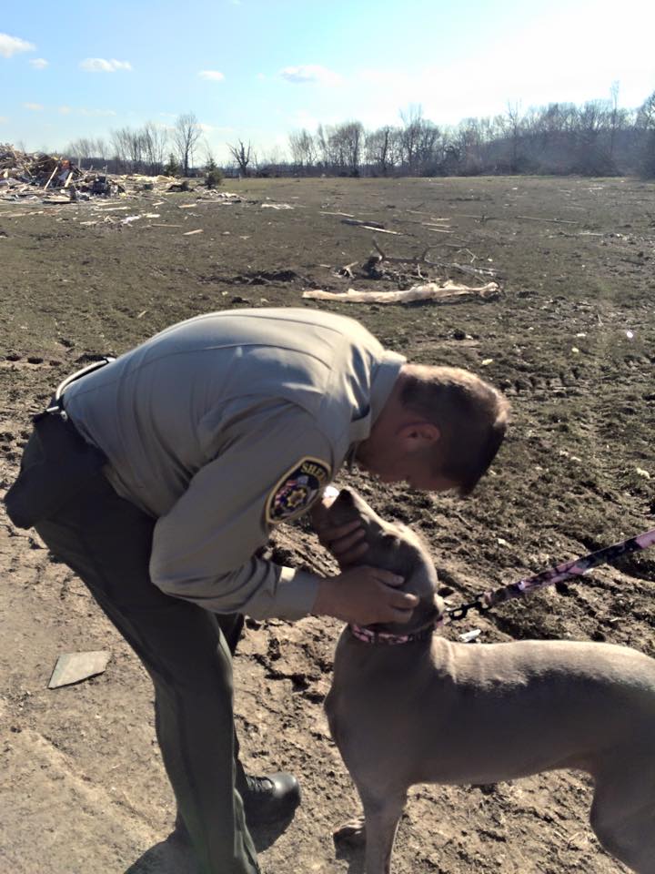 (Ogle County Sheriff Brian VanVickle with the family dog, Roxy, who was the only one home when a tornado hit their house.)