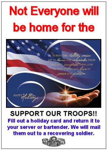 Fill out a Holiday card at O’Leary’s and return it to your server and O’Leary’s will send out to a recovering soldier!
