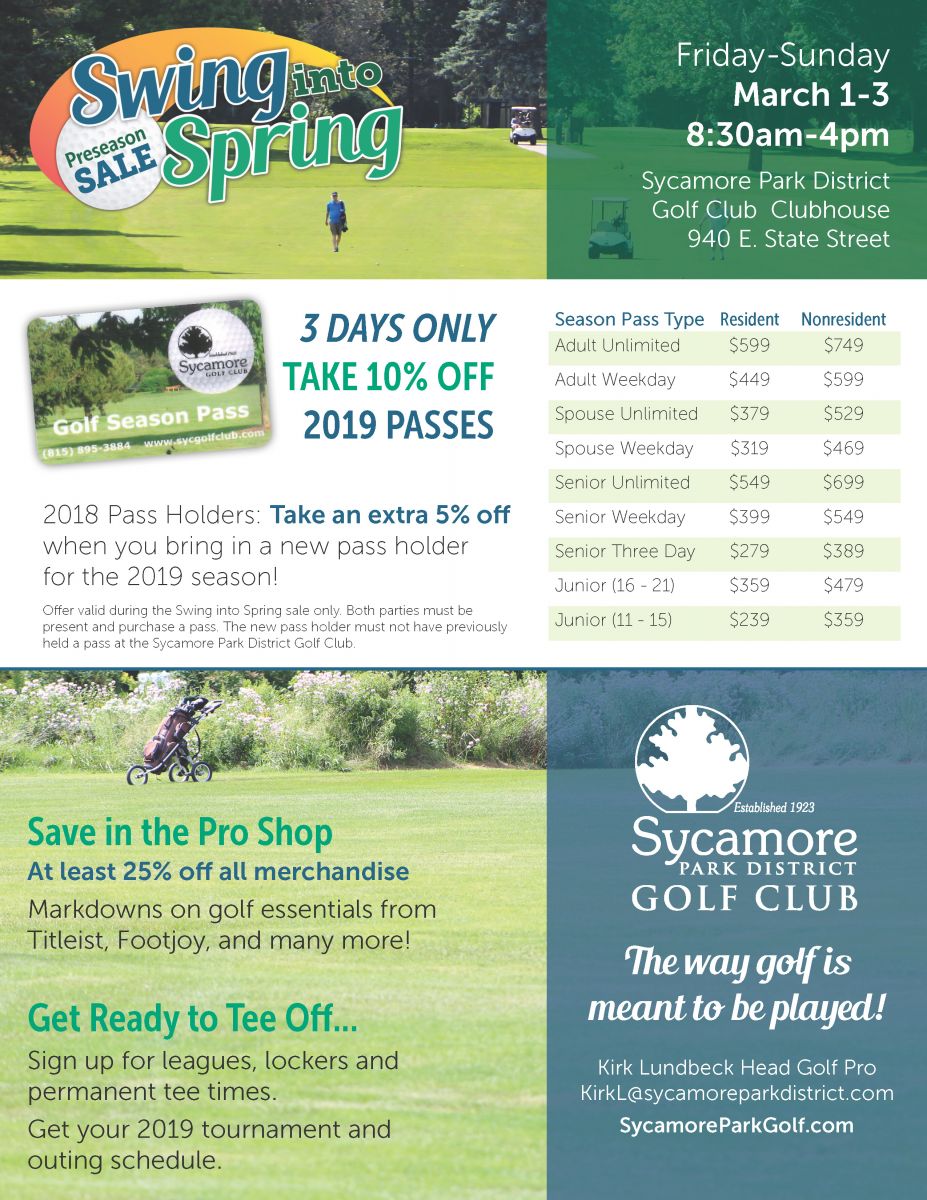Only one more day to save on Sycamore Park District Golf Club’s Swing into Spring Sale! It ends on March 3, 2019.