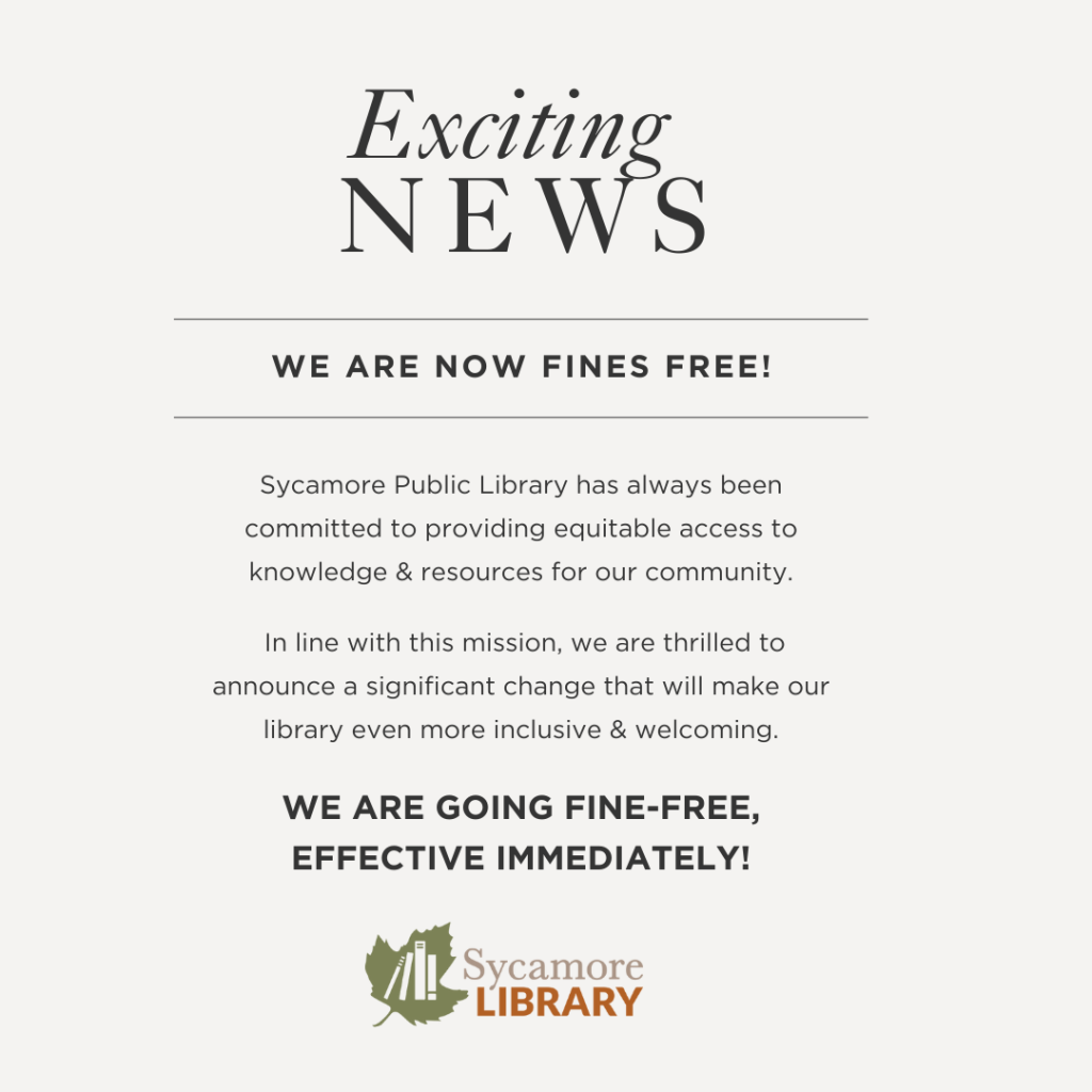 Sycamore Public Library has always been committed to providing equitable access to knowledge and resources for our community. In line with this mission, we are thrilled to announce a significant change that will make our library even more inclusive and welcoming. We are going fine-free, effective immediately!
