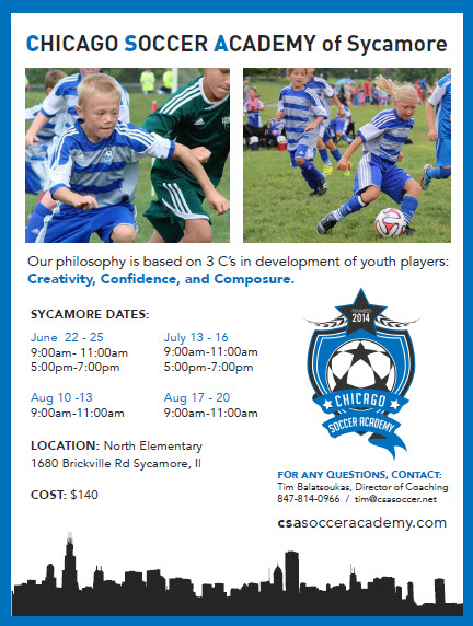 Chicago Soccer Academy of Sycamore is hosting FREE Soccer Clinic Saturday, Mar 21st ages 4-10