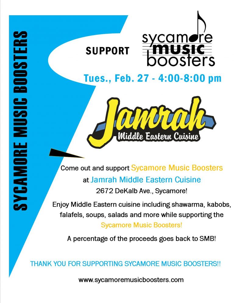Jamrah No-Cook Dinner Fundraiser for the Sycamore Music Boosters Tuesday