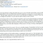 The attached file (click on thumbnail image) is a digital copy of an email Fauci sent to a constituent on Feb. 22, 2010. This date is important for two reasons: 1) it is one week before the Public Hearing and 2) it is the day that Fauci read County Administrator, Ray Bockman’s email to all board members informing them that they could not discuss anything related to the siting application or the landfill with their constituents.