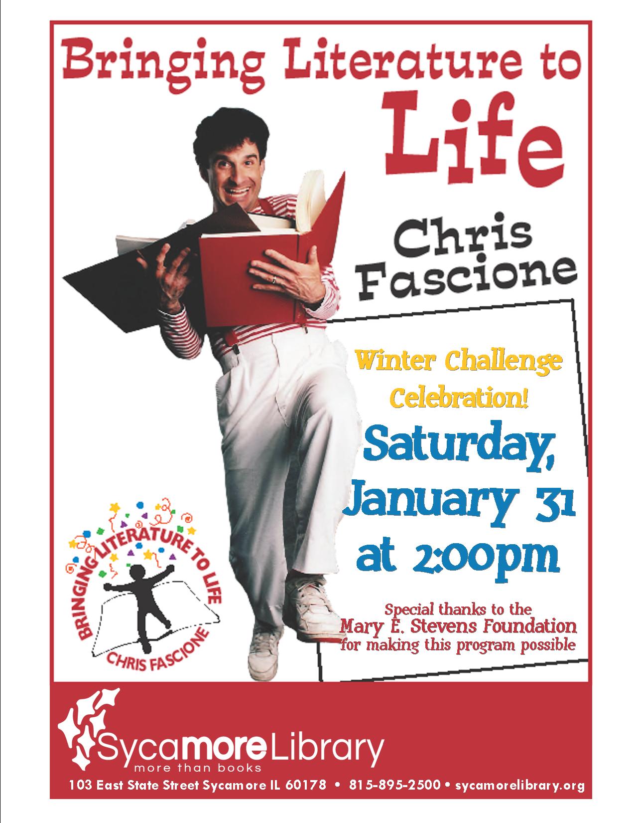 You’ll be laughing out loud as nationally-known family entertainer, Chris Fascione, brings children’s stories to life with his high-spirited and innovative performances. Full of energy, humor and imagination, Chris creates colorful characters through his unique combination of acting, storytelling, comedy, and juggling. A Storytelling World Award winner, Chris brings out the kid in everyone, as adults and children alike have fun participating in the show. See Chris at the Sycamore Library this Saturday, January 31st, 2015 at 2pm. Click here to learn more about Chris Fascione now online.