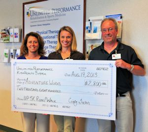 Cindy Tucker, director of KishHealth System Physical Therapy, and Chris Laurent, athletic trainer and 5K race director, of Unlimited Performance Rehabilitation & Sports Medicine, KishHealth System’s physical therapy department, presented a $2,800 donation to Adventure Works Executive Director Lynette Spencer, MSW, LCSW. Proceeds from the annual Unlimited Performance 5K Run/Walk are matched by KishHealth System and then donated to a local non-profit organization each year. This is the first time the health system has donated to Adventure Works.