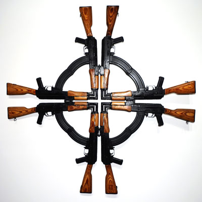 “Cross for the Unforgiven: 10th Anniversary Multiple,” 1 of 2, by Mel Chin, 2012. AK47 assault rifles cut and welded. Courtesy of the artist.