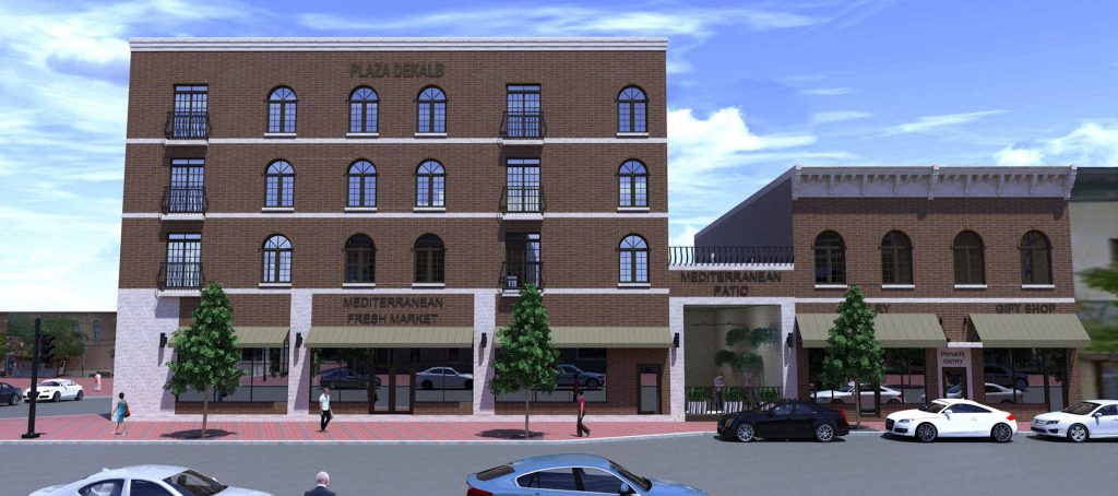 Facade work recently commenced on the eastern most buildings of the Plaza DeKalb project located at the northeast corner of North Second Street and East Lincoln Highway. The facade work will be completed this fall and demolition and reconstruction of the remaining buildings in the project will begin next spring. Once completed, Plaza DeKalb will contain 23 apartment units and first floor commercial space.