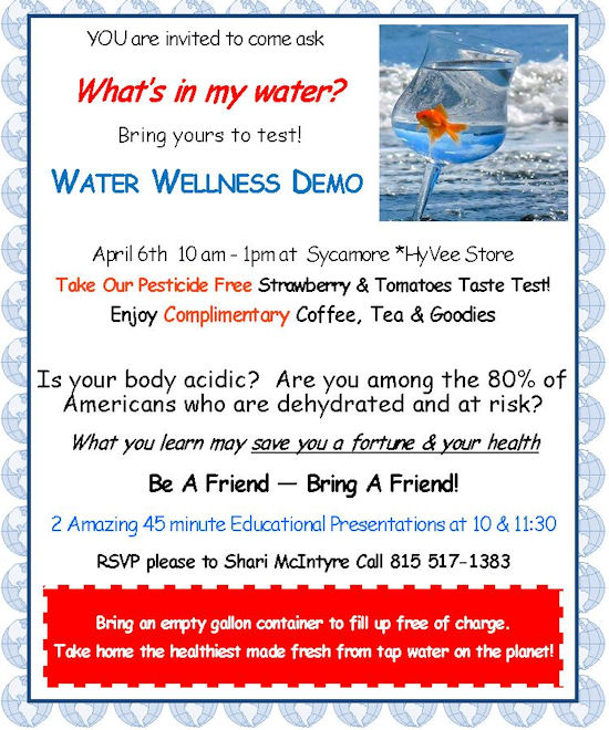 You are invited to come ask ‘What’s in my water?” Come to the Water Wellness Demo this Saturday, April 6th from 10am to 1pm at the Sycamore HyVee Store. Bring your water with you to test it! Take their pesticide free strawberry and tomatoes taste test. Enjoy complimentary coffee, tea and goodies.