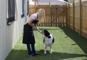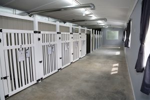 Dogs are boarded in a 4’ x 6’ suite, with four let-outs per day. This includes a brief walk in our fenced-in yard, and time to go potty at 6 a.m., 12 p.m., 5 p.m. and 8 p.m. Feedings are offered at 6 a.m. and 5 p.m. daily, and if your dog requires a lunch, they are happy to give one at 12 p.m.